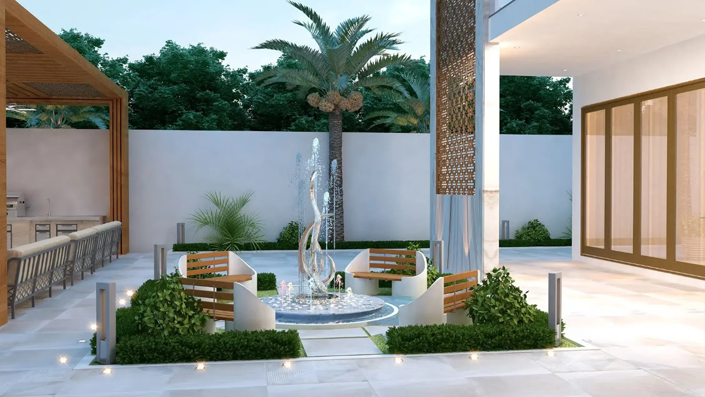 Outdoor cooking and entertainment zones with BBQ setups and stylish bar counters, ideal for social gatherings.